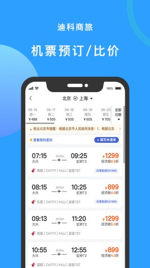 通過迪科商旅客戶端隨時隨地預(yù)訂國內(nèi)全部航線及協(xié)議航空的單程機票,退票改簽也可一鍵觸達。