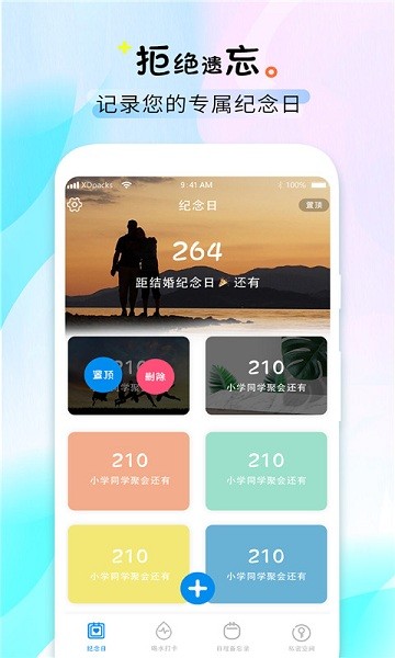 各種紀念日容易遺忘?在本款APP中進行添加保存吧,可以設(shè)置你的紀念日背景和置頂顯示,讓你的紀念日成為專屬定制。