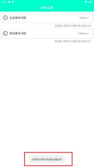 4、點(diǎn)擊后,在頁面內(nèi)會彈出修改成功,再次開啟連點(diǎn)器生效的提示。