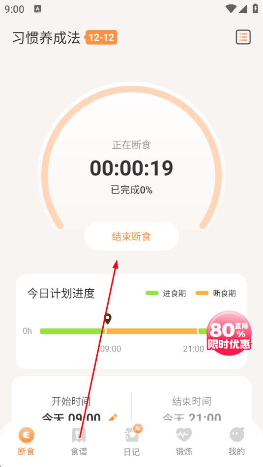 1、打開(kāi)怪獸輕斷食應(yīng)用,在當(dāng)前斷食界面,點(diǎn)擊結(jié)束斷食按鈕。