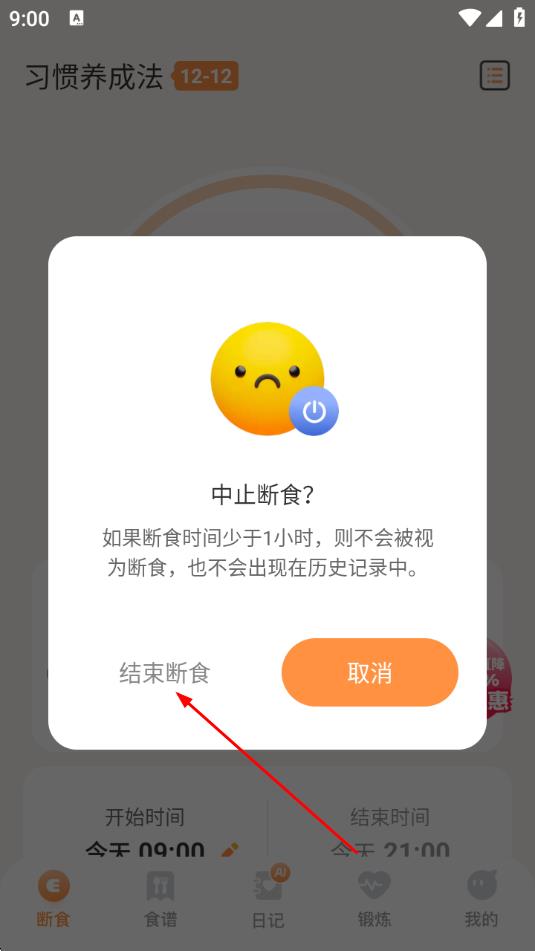 2、在彈出的確認(rèn)中止斷食的彈窗中,點(diǎn)擊結(jié)束斷食選項(xiàng)。