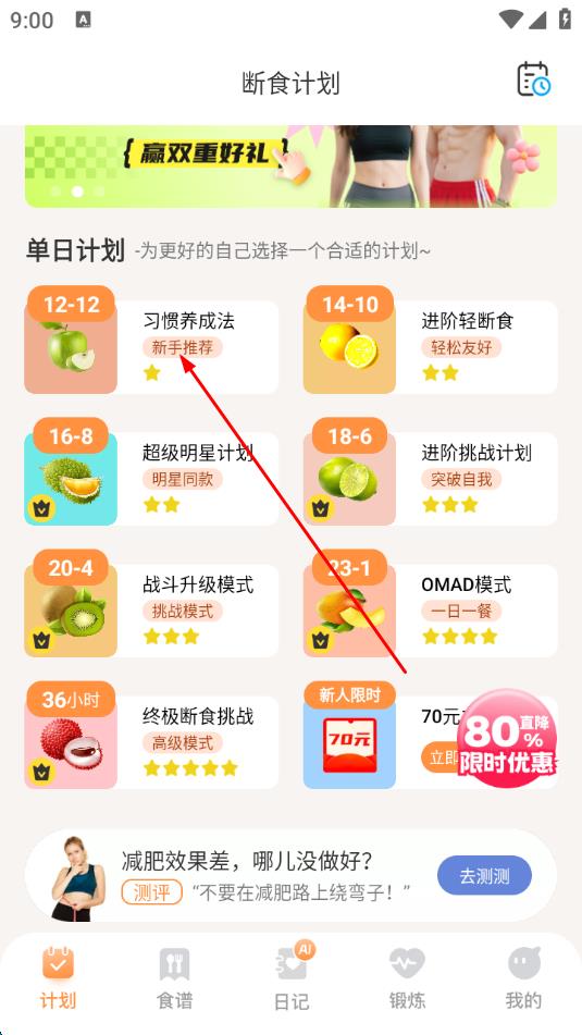 3、進(jìn)入斷食計(jì)劃選擇界面,瀏覽不同的斷食計(jì)劃,選擇適合自己的新計(jì)劃。