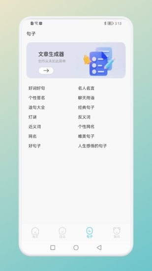 一言一句手機(jī)app為用戶帶來(lái)更多的唯美句子,軟件之中還可以根據(jù)用戶的要求來(lái)生成更多的名言和文章,讓用戶每天都可以獲得不同的美文和名言,還有許多的詞語(yǔ)和名句可以學(xué)習(xí)。