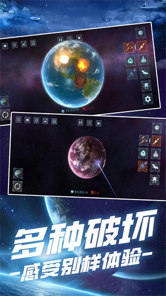 體會令人震撼的視覺沖擊,有各類游戲道具可以摧毀星球和道具,采用多種裝備和設施摧毀行星。