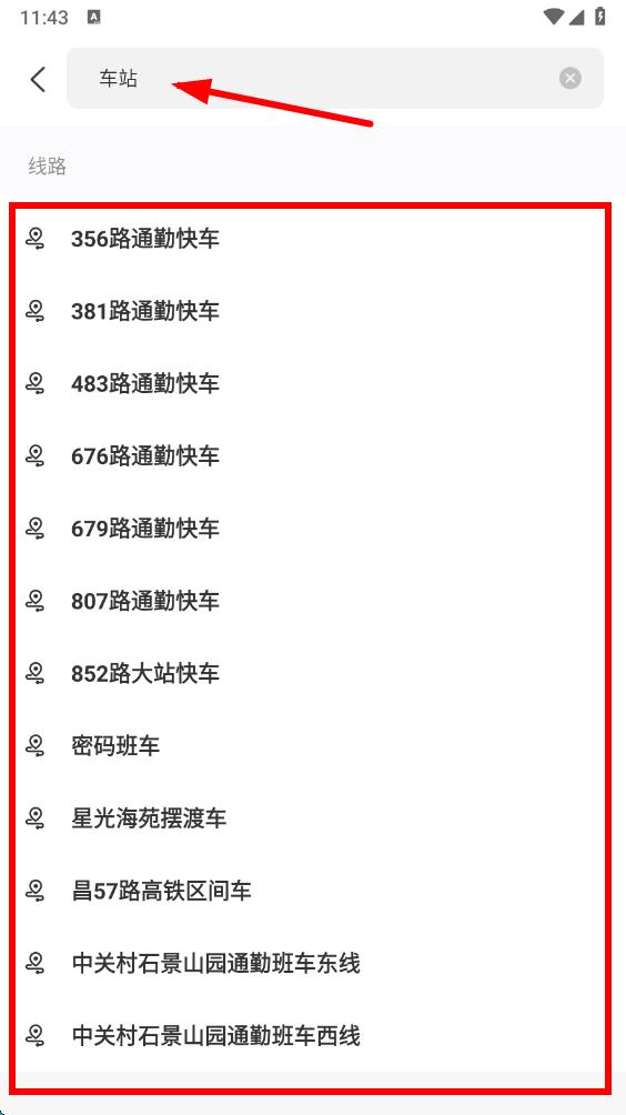 3、在搜索框中,輸入想要設(shè)置提醒的公交車站或公交線路關(guān)鍵詞,隨后會(huì)出現(xiàn)相關(guān)的公交線路列表,從中選擇目標(biāo)公交線路。