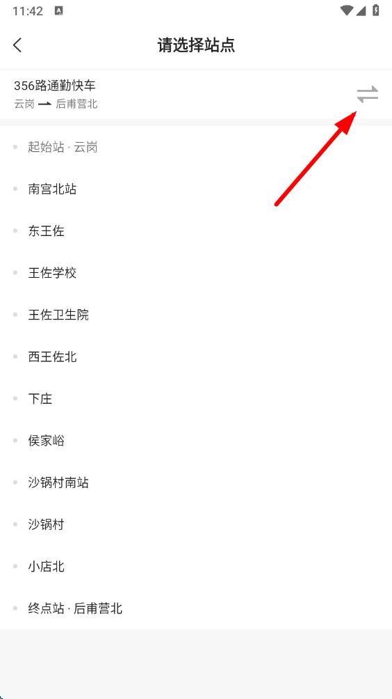 4、選擇公交線路后,進(jìn)入站點(diǎn)選擇頁(yè)面,可根據(jù)需求點(diǎn)擊箭頭圖標(biāo)切換線路方向,并選擇具體站點(diǎn),完成公交車提醒功能的添加。