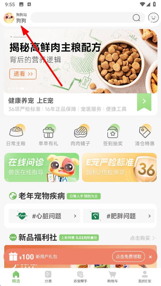 1、打開E寵商城app進(jìn)入首頁界面,在首頁左上角找到顯示狗狗站的區(qū)域。