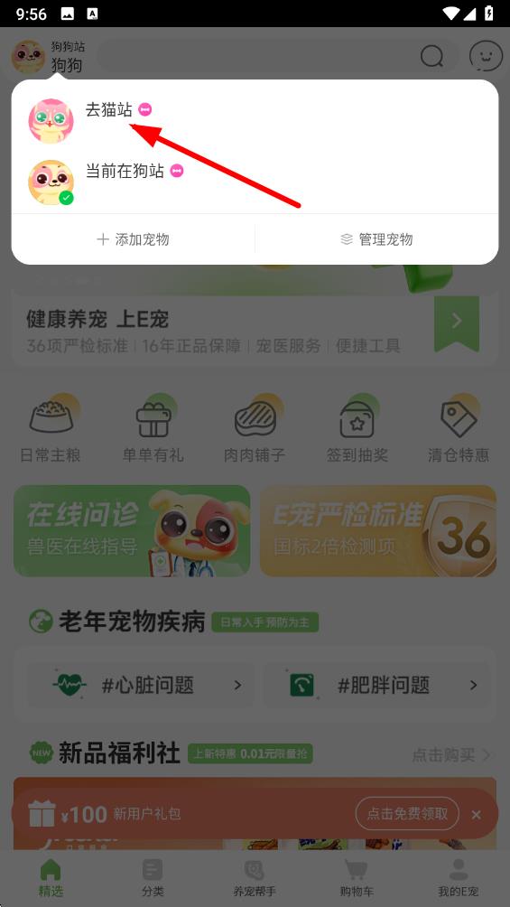 2、點擊后會彈出一個選擇,在選擇框里找到去貓站選項,點擊此選項。