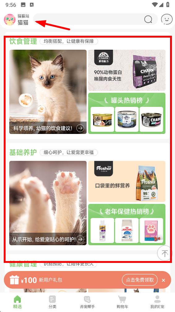 3、點擊去貓站后,頁面會自動跳轉(zhuǎn)到貓站首頁,在貓站首頁你可以與貓咪相關(guān)的商品推薦及養(yǎng)寵內(nèi)容板塊,方便選購貓咪用品。