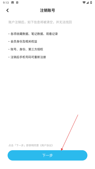 4、在注銷賬號(hào)說明頁面,點(diǎn)擊下一步按鈕,進(jìn)入賬號(hào)安全驗(yàn)證頁面。