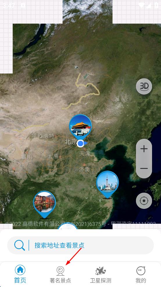1、打開地圖類APP,進(jìn)入首頁后,點(diǎn)擊底部導(dǎo)航欄中的“著名景點(diǎn)”選項(xiàng),進(jìn)入著名景點(diǎn)相關(guān)頁面。