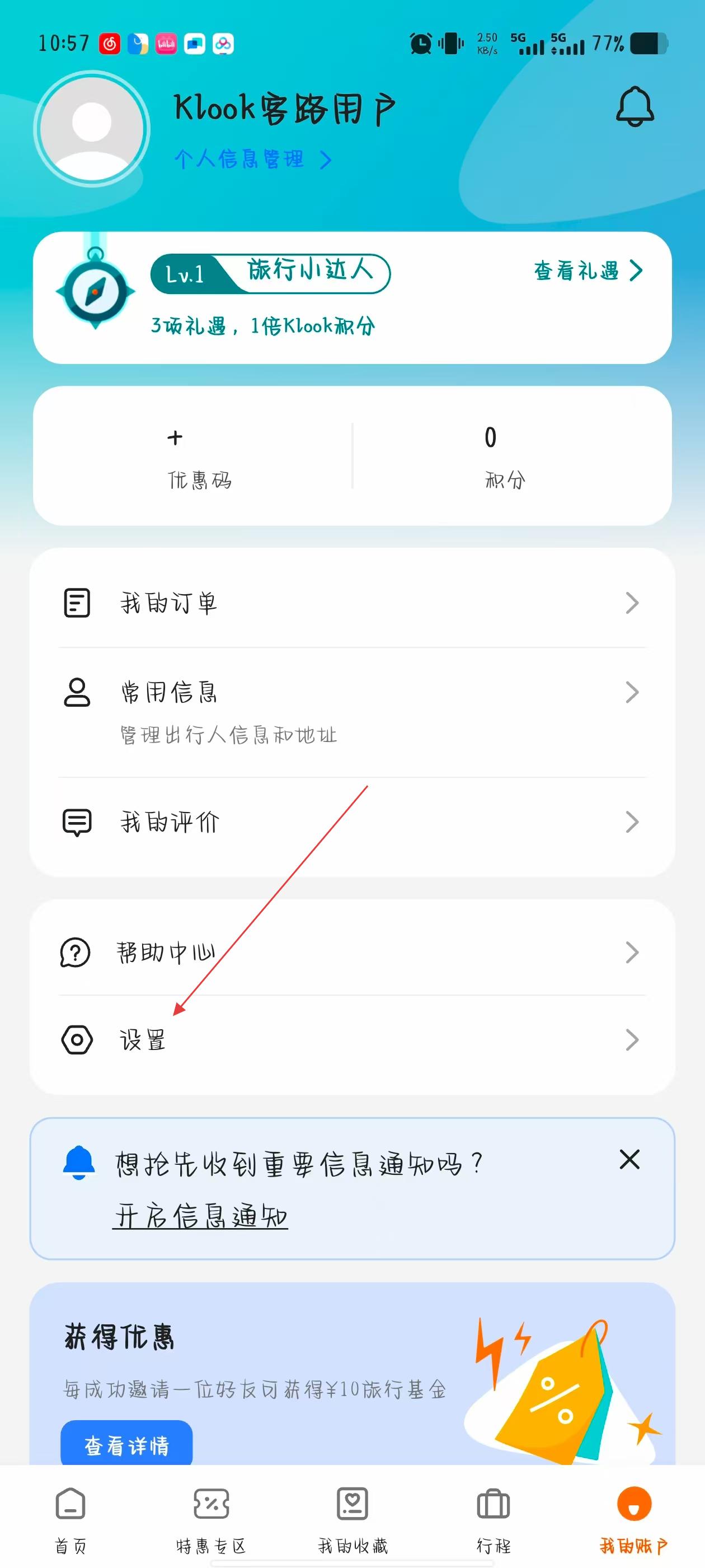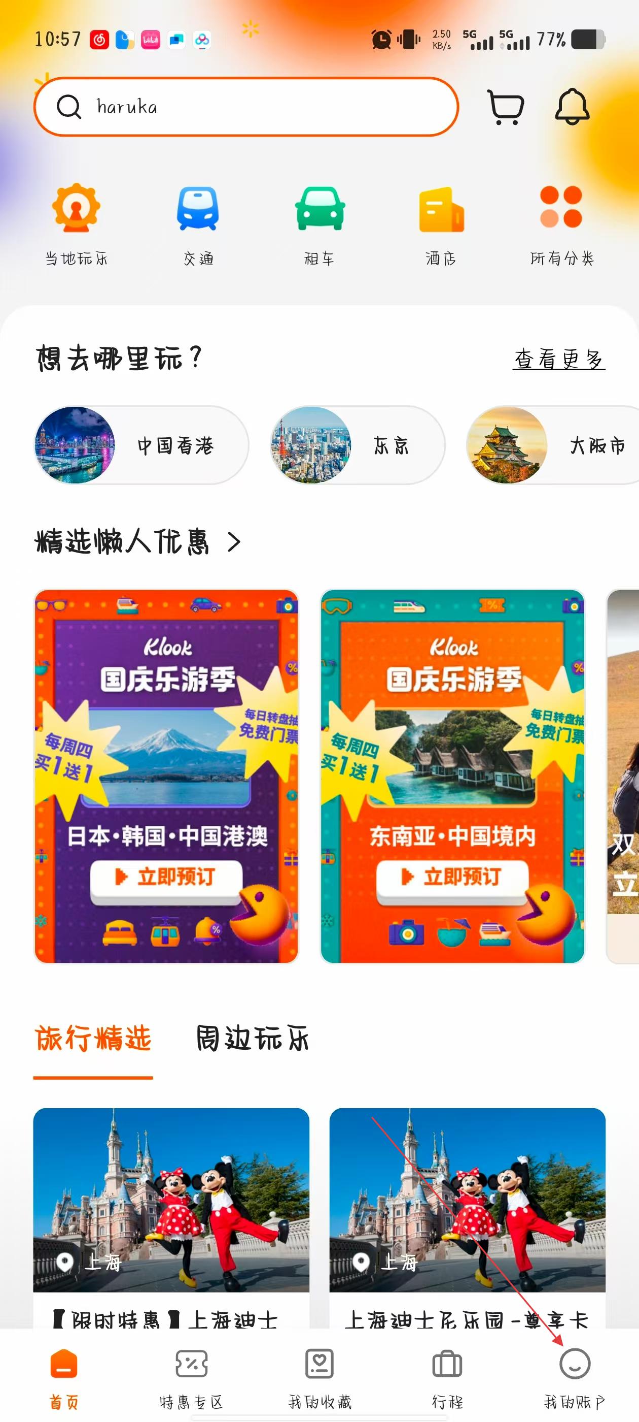 1、打開(kāi)KLOOK客路旅行APP,點(diǎn)擊頁(yè)面右下角我的圖標(biāo),進(jìn)入個(gè)人中心頁(yè)面。
