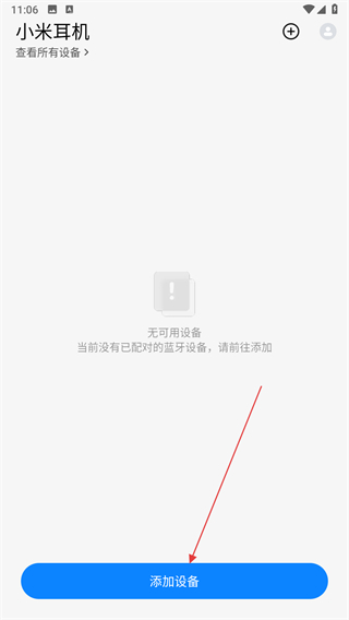 1、打開小米耳機應用,在主界面點擊添加設備按鈕,進入設備添加流程。