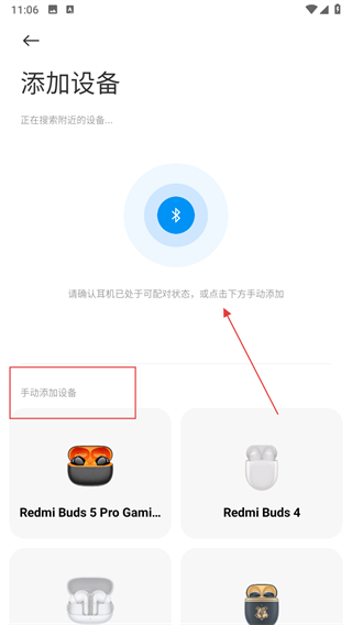 2、在添加設備界面,應用會自動搜索附近設備,需手動添加,可在手動添加設備區(qū)域,選擇對應的耳機型號。