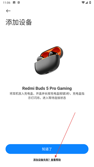 3、點擊知道了進入配對界面,若添加設備失敗,點擊查看幫助,進入添加設備指南頁面。