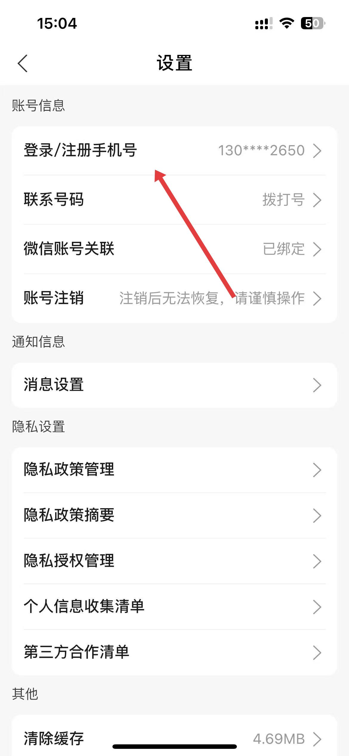 3、在設(shè)置頁(yè)面里,找到登錄注冊(cè)手機(jī)號(hào)選項(xiàng)并點(diǎn)擊,進(jìn)入更換手機(jī)號(hào)相關(guān)界面。