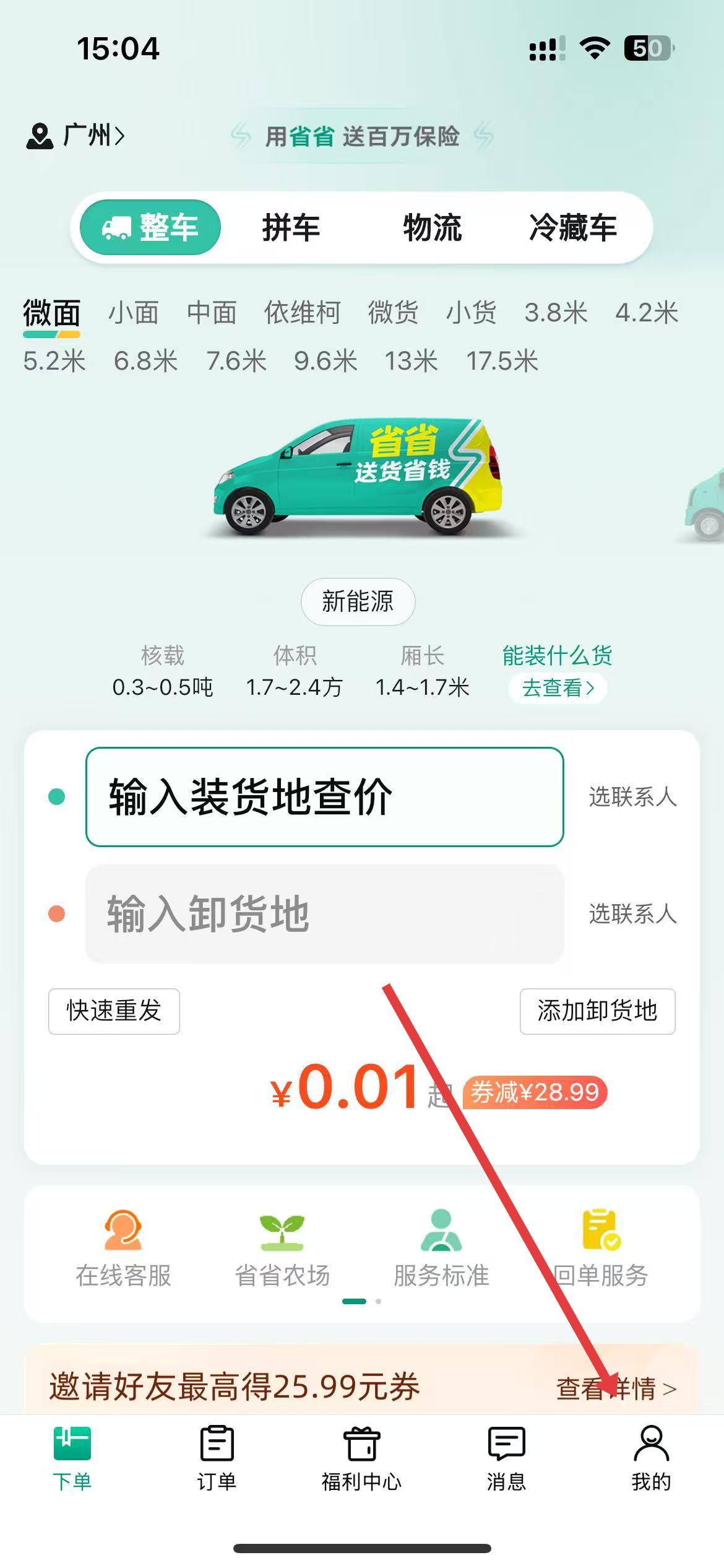 1、打開(kāi)省省回頭車app,進(jìn)入主界面,點(diǎn)擊底部導(dǎo)航欄中的我的圖標(biāo),進(jìn)入個(gè)人界面。