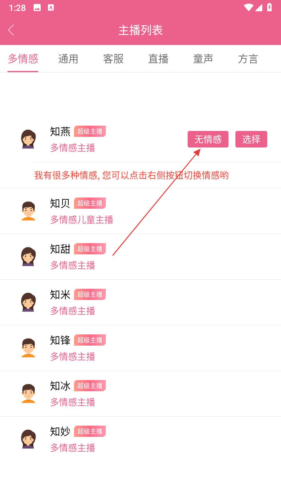 2、點(diǎn)擊選擇主播進(jìn)入列表,按多情感、通用等類別挑選主播,多情感的主播是可以選擇情感的。