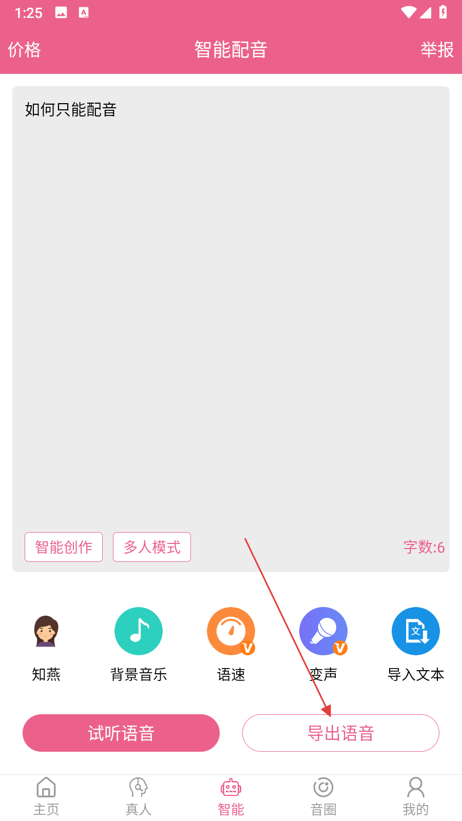 3、完成上述操作后點(diǎn)擊試聽語(yǔ)音聽效果,滿意就點(diǎn)擊導(dǎo)出語(yǔ)音保存配音,不滿意就返回修改直到達(dá)到想要的效果。