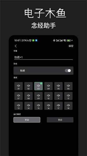 - 擁有多種敲擊模式,手動和自動模式,在自動模式下,自由設(shè)置參數(shù),自動敲打屏幕上的木魚。