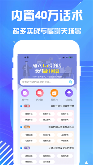 聊天對(duì)話(huà)神器是一款非常簡(jiǎn)單的幫助用戶(hù)學(xué)習(xí)追人說(shuō)話(huà)技巧的軟件,在這里的各種內(nèi)容都是非常的豐富,還會(huì)有更多的精彩內(nèi)容也可以免費(fèi)的在線(xiàn)了解,幫助更多的用戶(hù)輕松的學(xué)習(xí)很多的回復(fù)知識(shí),還可以鍛煉自己的情商。