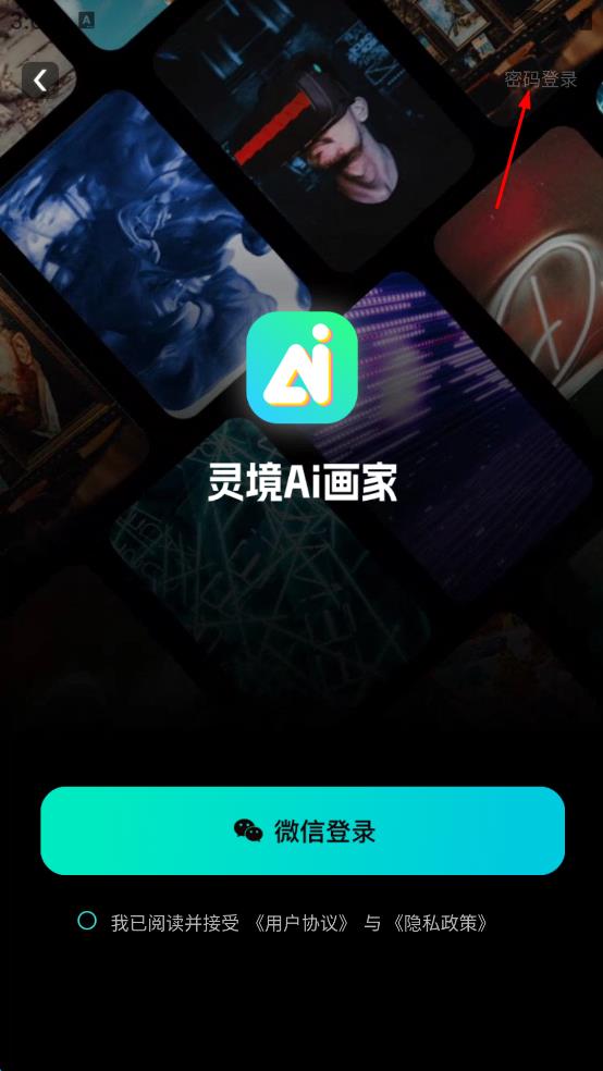 1、打開靈境AI畫家APP,點(diǎn)擊密碼登錄,進(jìn)入密碼登錄界面。