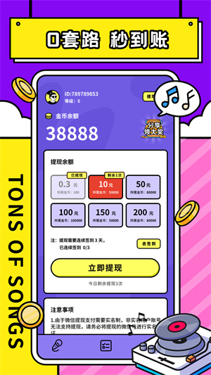 猜歌達(dá)人賺錢里面的各種音樂資源都是熱門和流行的歌曲,大家也可以輕松的進(jìn)行猜歌,還可以做任務(wù)和每日簽到來賺取很多的零花錢。