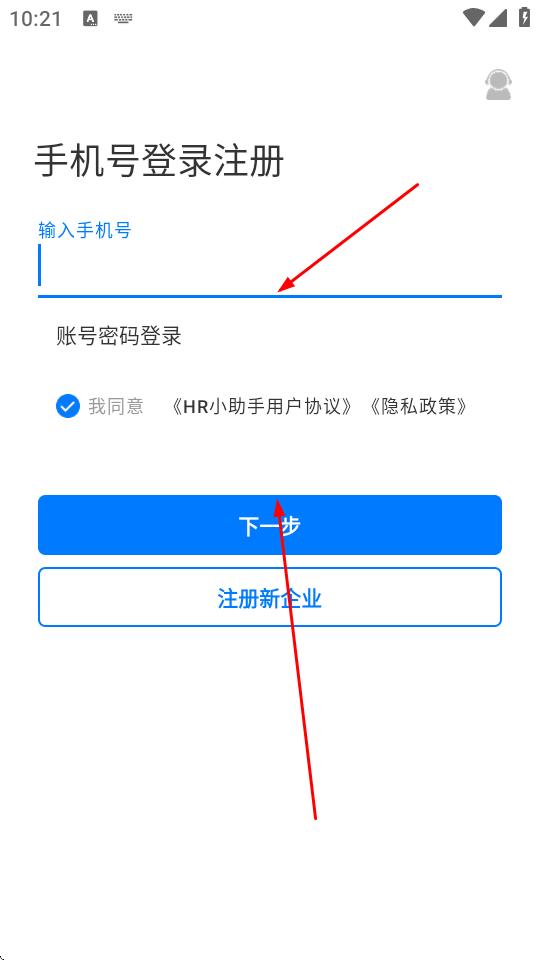 4、在手機(jī)號(hào)登錄注冊頁面,輸入手機(jī)號(hào),勾選同意HR小助手用戶協(xié)議隱私政策,點(diǎn)擊下一步,完成登錄操作。