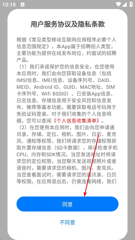 1、打開HR小助手APP,在彈出的用戶服務(wù)協(xié)議及隱私條款頁面,點(diǎn)擊同意。