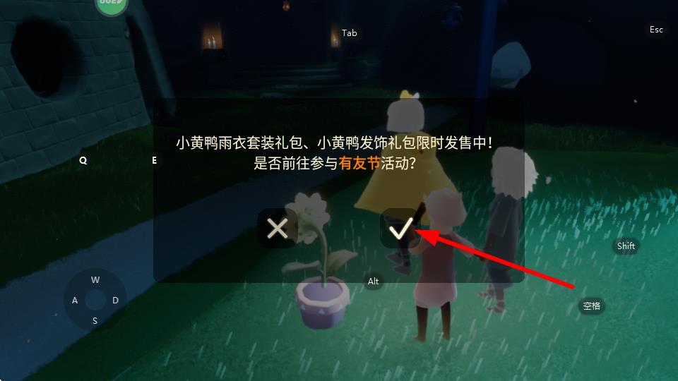 1、當(dāng)游戲彈出“小黃鴨雨衣套裝禮包、小黃鴨發(fā)飾禮包限時發(fā)售中!是否前往參與有友節(jié)活動?”提示時,點(diǎn)擊√按鈕進(jìn)入活動界面。