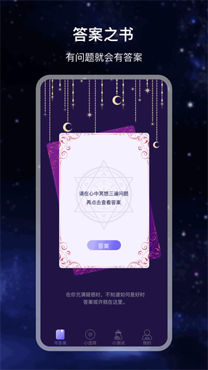 - 遇到任何需要做答案的問題、難題,都可以在這里隨機(jī)翻開答案之書看到答案;