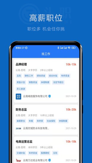 頭職是云南本地的專業(yè)求職招聘找工作平臺,業(yè)務(wù)覆蓋云南全省,包括昆明、曲靖、大理、玉溪、紅河、楚雄、文山、普洱、保山、西雙版納、昭通、德宏、臨滄、麗江、迪慶等,覆蓋行業(yè):互聯(lián)網(wǎng)、金融、汽車、房產(chǎn)、快消、制造、人工智能、廣告?zhèn)髅降雀餍懈鳂I(yè),現(xiàn)已成為銷售、財務(wù)、技術(shù)、IT、產(chǎn)品、人資、管理……廣大求職者選擇的應(yīng)用APP。平臺作為企業(yè)和求職者溝通的橋梁,讓人才和機會更準(zhǔn)確高效地建立連接。通過頭職提供的服務(wù),可以讓企業(yè)高效便捷地獲取到更新的人才資訊,使企業(yè)HR在搶才的過程快人一步,用更短的時間、更低的成本、更準(zhǔn)確的方式鎖定合適的人才。通過為求職者提供豐富的職位信息,打造匹配的職位搜索引擎,創(chuàng)造流暢的信息交流渠道,頭職力求為更多的求職者提供合適的工作崗位和普遍的職業(yè)晉升機會,幫助職場人更成功。
