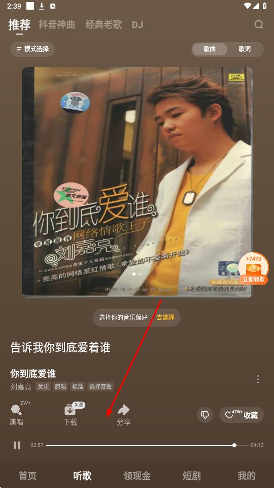 2、在聽歌頻道,選擇播放劉嘉亮的《你到底愛誰》封面顯中國原創(chuàng)網(wǎng)絡(luò)情歌王子下方設(shè)演唱、下載、分享等按鈕,點(diǎn)擊分享按鈕箭頭樣式,位于播放控制欄中間。