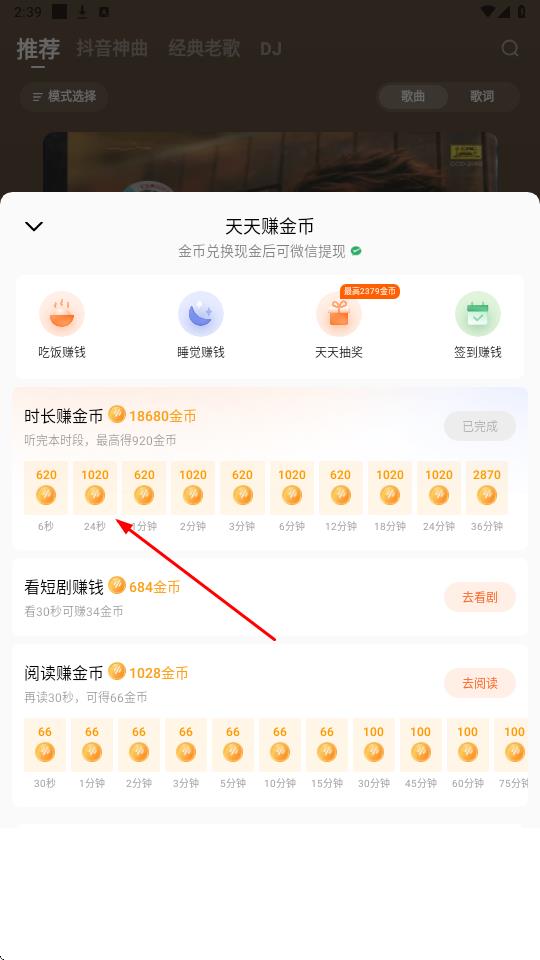 3、完成操作后進(jìn)入天天賺金幣界面,找到時(shí)長賺金幣模塊顯示聽完本時(shí)段,最高得920金幣,點(diǎn)擊24秒對應(yīng)的金幣圖標(biāo)標(biāo)1020金幣,參與時(shí)長賺金幣任務(wù)。