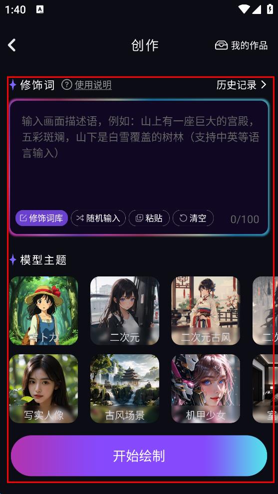 4、登錄后進入創(chuàng)作頁面,在“輸入畫面描述語”欄填寫想要生成的畫面描述,再選擇模型主題,比如“二次元”“古風場景”等,之后點擊“開始繪制”,即可生成相應(yīng)的繪畫作品。