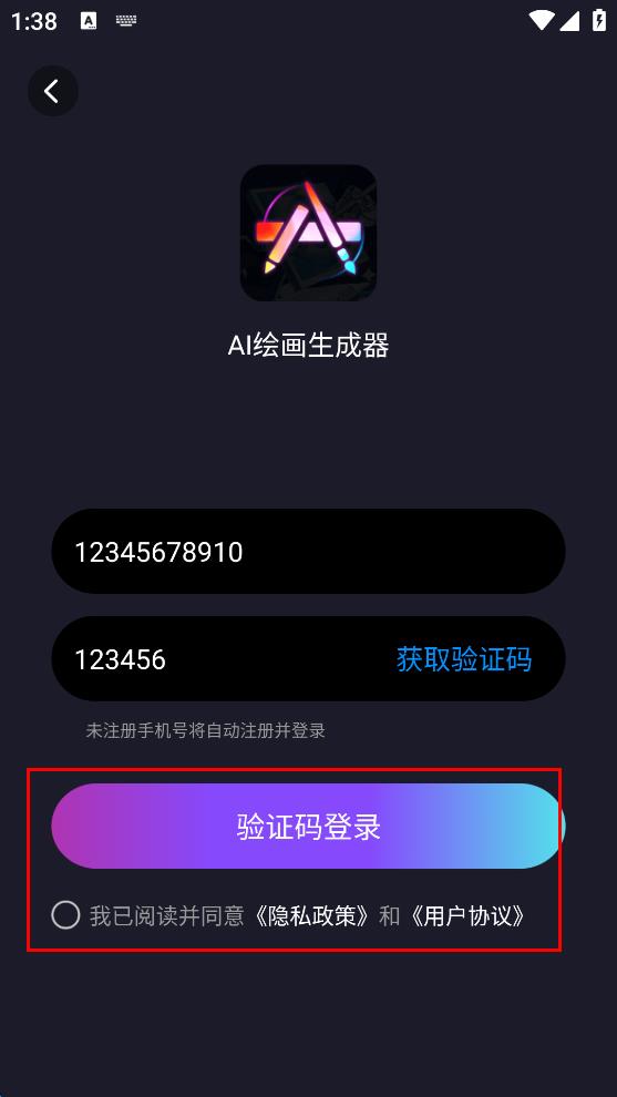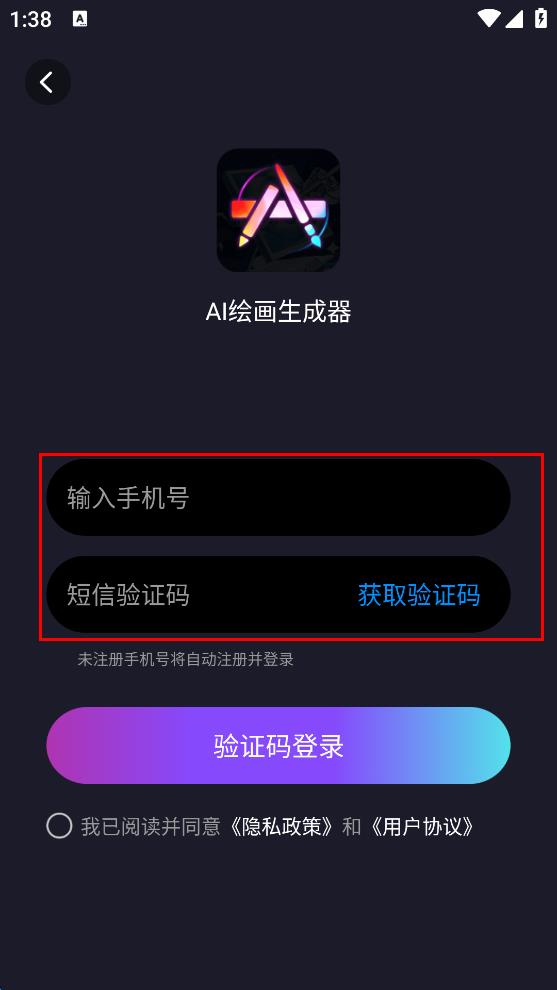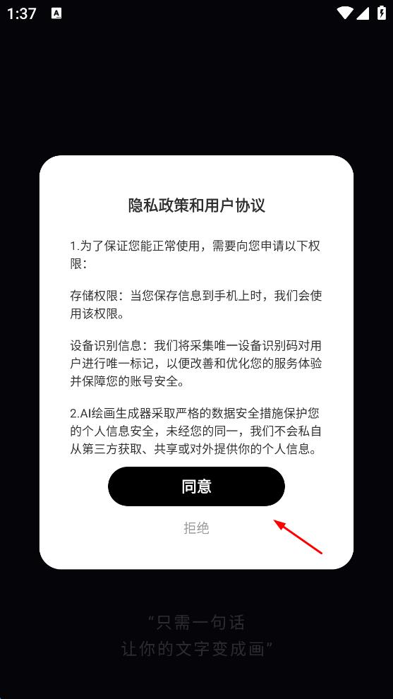 1、打開AI繪畫生成器軟件,彈出“隱私政策和用戶協(xié)議”提示彈窗,閱讀相關(guān)內(nèi)容后,點擊“同意”,進入登錄頁面。