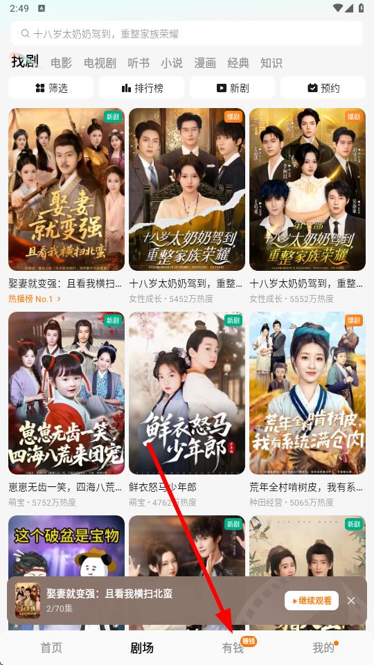 1、打開紅果短劇應(yīng)用,點擊底部導(dǎo)航欄中的有錢選項。