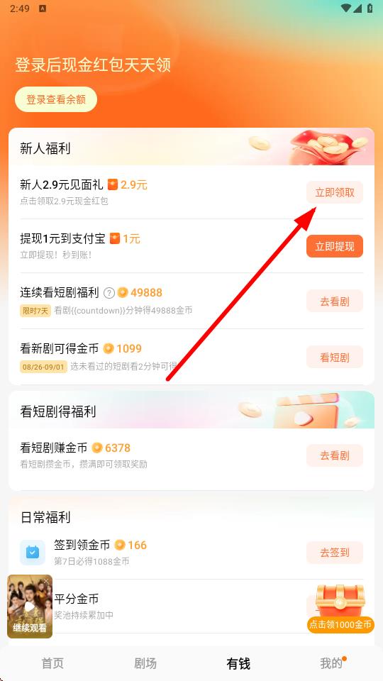 3、在有錢頁面,完成相應(yīng)任務(wù),比如領(lǐng)取新人見面禮,點擊立即領(lǐng)取達到提現(xiàn)條件后進行提現(xiàn)。