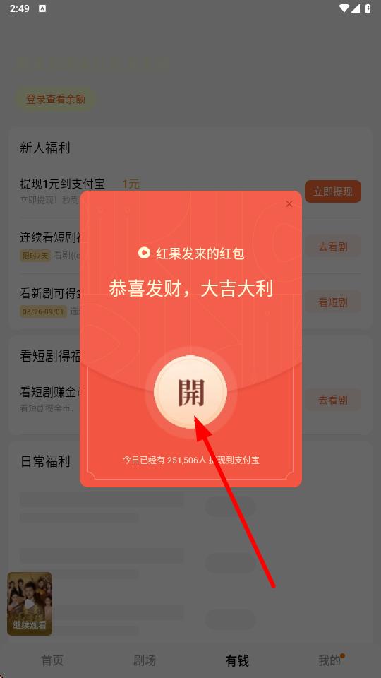 2、進入有錢頁面后,可能會彈出紅包,點擊紅包中間的開。