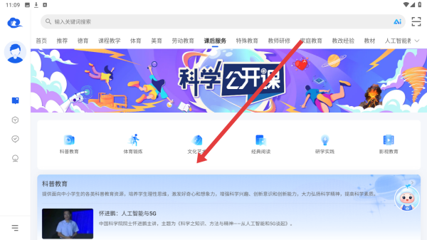 2、進(jìn)入課后服務(wù)板塊后,下拉屏幕瀏覽頁面內(nèi)容,可查看科學(xué)公開課等不同分類的課后服務(wù)項(xiàng)目,了解各項(xiàng)目的主題與簡介信息。