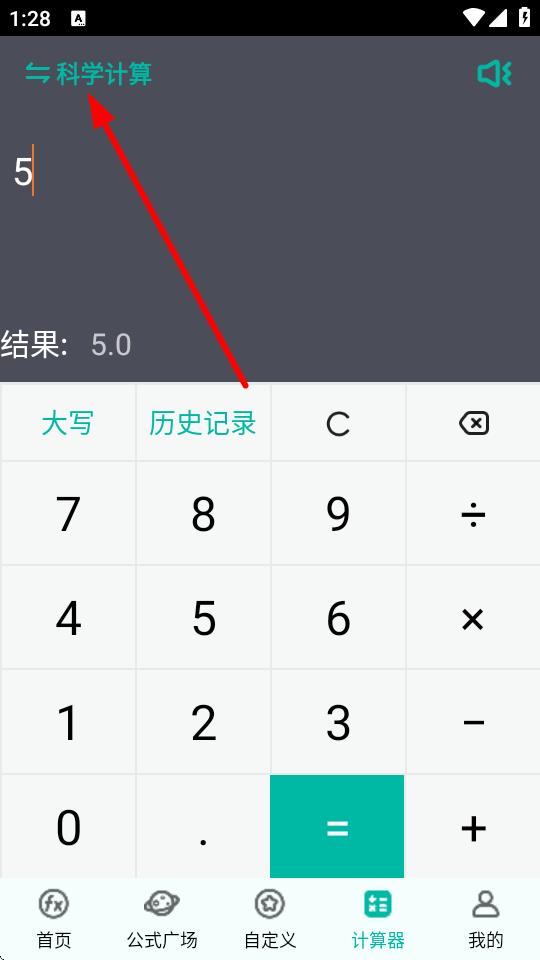2、進(jìn)入計(jì)算器界面后,點(diǎn)擊左上角的科學(xué)計(jì)算,切換到科學(xué)計(jì)算模式。