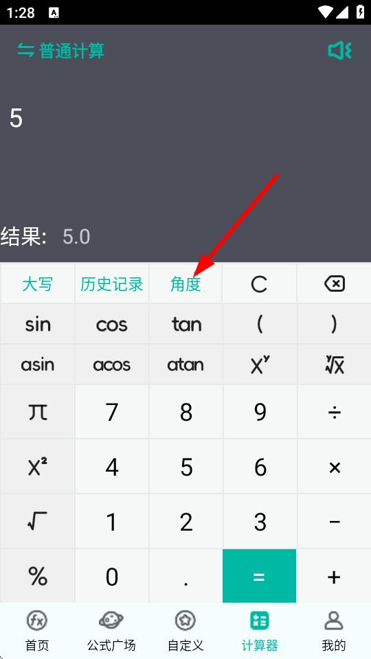 3、在科學(xué)計(jì)算模式下,點(diǎn)擊角度選項(xiàng),調(diào)出角度相關(guān)計(jì)算功能。