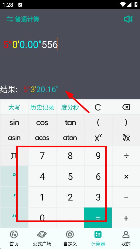 4、輸入角度數(shù)值,計(jì)算器會(huì)自動(dòng)進(jìn)行計(jì)算并顯示結(jié)果,例如輸入5°0'0.00"556,結(jié)果會(huì)顯示為5°3'20.16。