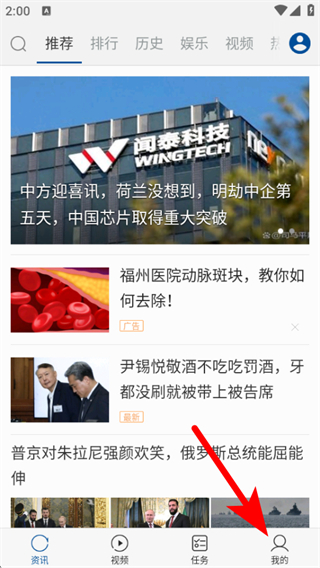 1、打開環(huán)球新軍事app,在首頁點擊底部我的,進入個人頁面。