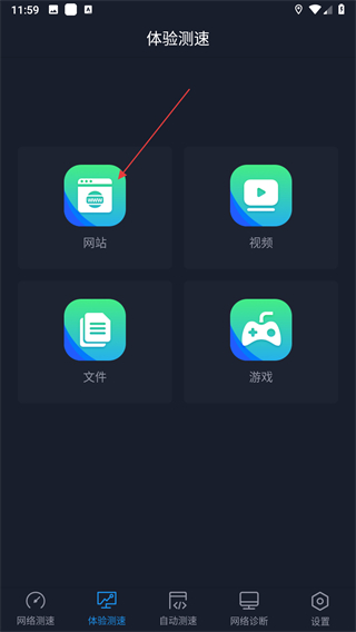 2、在體驗(yàn)測(cè)速頁(yè)面,選擇網(wǎng)站選項(xiàng),進(jìn)入網(wǎng)站測(cè)速頁(yè)面。