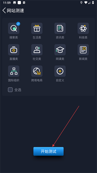 3、在網(wǎng)站測(cè)速頁(yè)面,選擇要測(cè)試的網(wǎng)站類別,點(diǎn)擊開始測(cè)試。