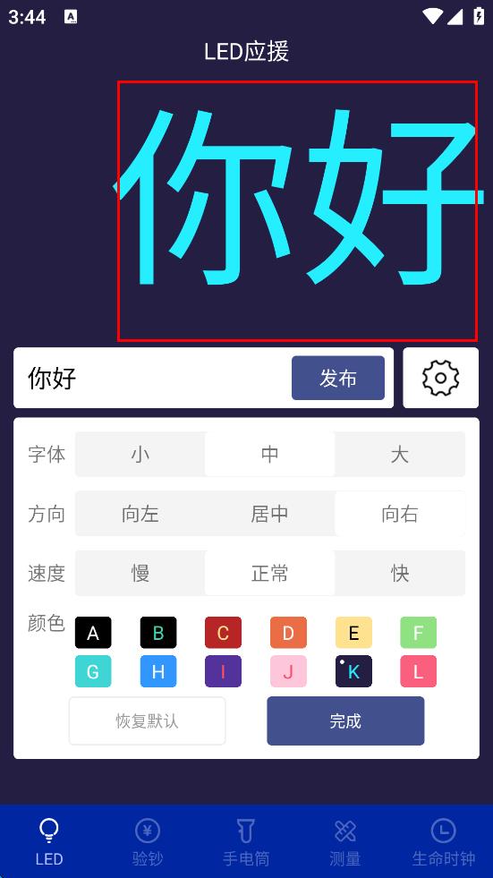 4、設(shè)置好字體、方向、速度、顏色等參數(shù)后,點(diǎn)擊完成按鈕,即可查看LED應(yīng)援顯示效果。