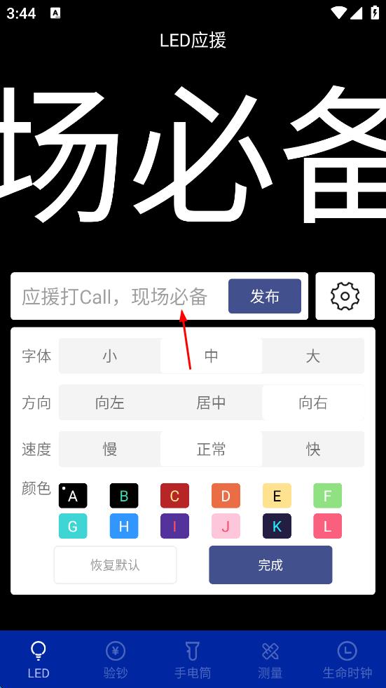 3、在LED應(yīng)援設(shè)置頁(yè)面,點(diǎn)擊輸入框,輸入要顯示的文字內(nèi)容。