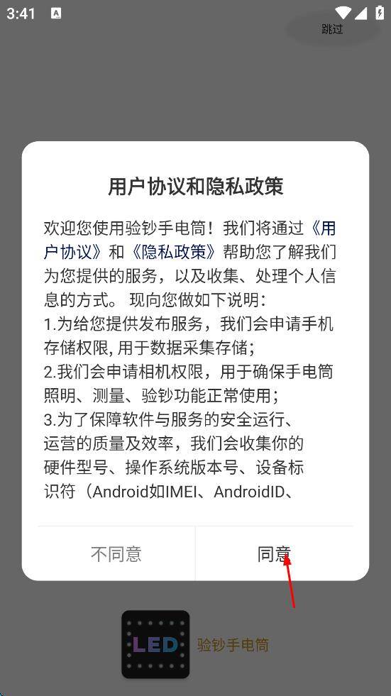 1、打開(kāi)驗(yàn)鈔手電筒APP,出現(xiàn)用戶協(xié)議和隱私政策彈窗,仔細(xì)閱讀內(nèi)容后,點(diǎn)擊同意按鈕。