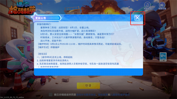 1、進入到游戲之中后,玩家將可以看見屏幕上的公告信息,點擊叉號以關(guān)閉相關(guān)信息欄;